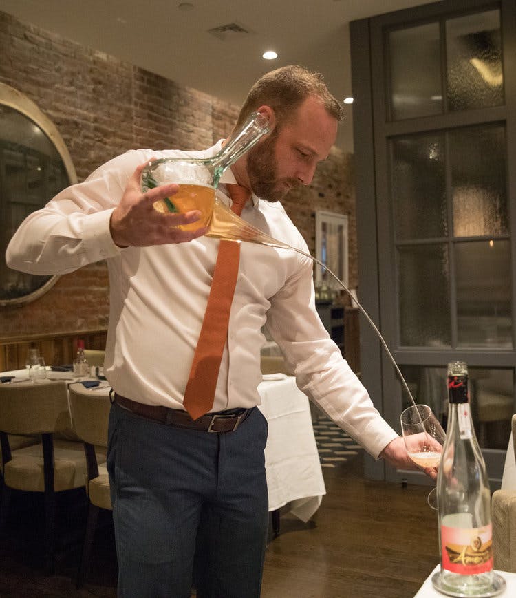 Order the Ameztoi and it will arrive in a porron (that's me pouring from one above), a traditional Catalonian drinking vessel. Crafted so that all guests can drink from the same glass without touching it to their lips, that's a messy proposition. Instead, we'll serve your rosé from the porron, giving you a glimpse at this cool wine accessory in action, while helping the rosé to breath some oxygen.
